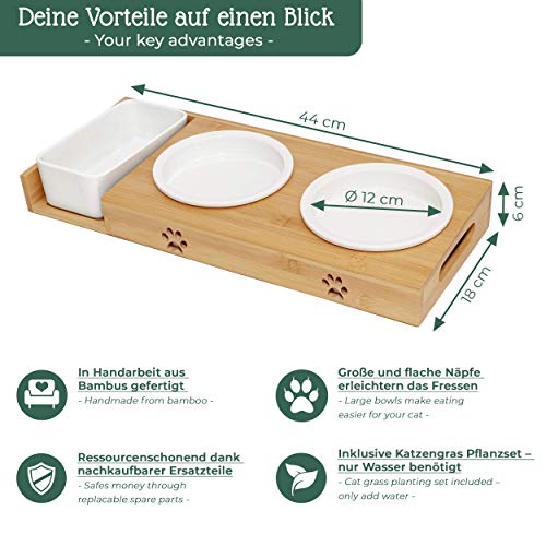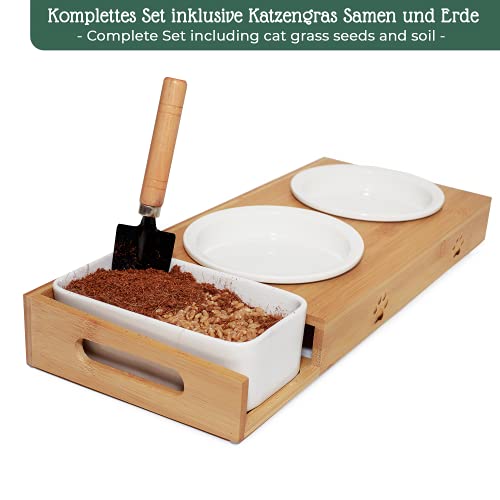 Futterstation mit Katzengras für Katzen – Katzennapf/Futternapf aus Porzellan – erhöhtes Napf-Set mit Katzengrasschale – Fressnapf hoch