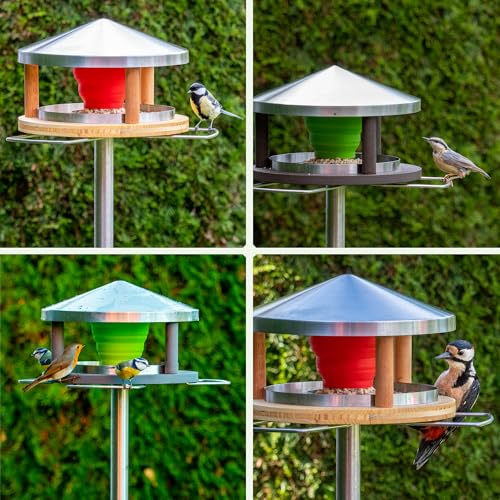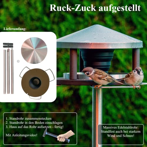 Vogelhaus mit Ständer wetterfest aus Edelstahl – Stabiles Vogelfutterhaus für draußen, modern aus Metall – Vogelfutterstation – Futterhaus für Vögel stehend