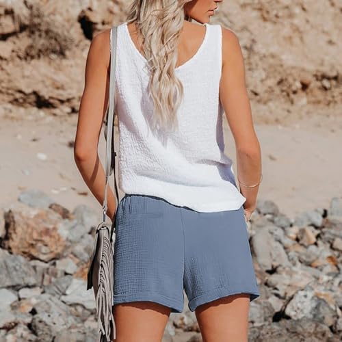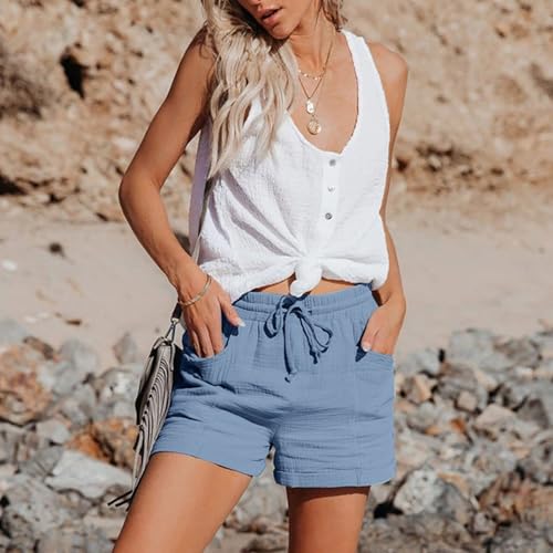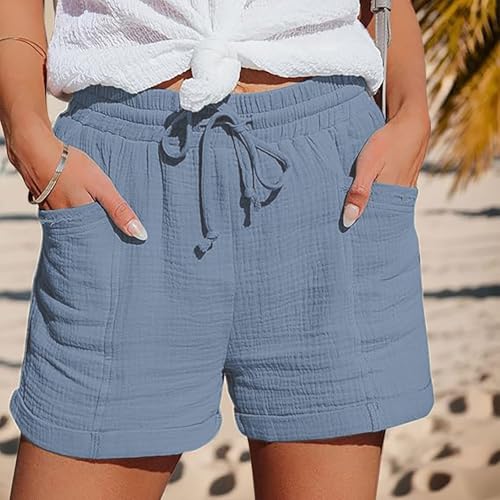 Shorts Damen 2025 Sommer Leinen Musselin Kurze Hose Beach Mit Taschen Mode Lässige Stoffhose Freizeit Stretch Gerades Bein Kordelzug Leinenhose