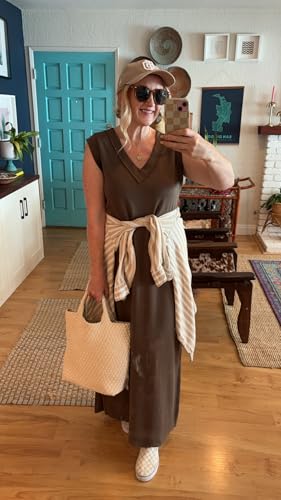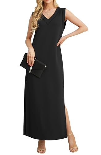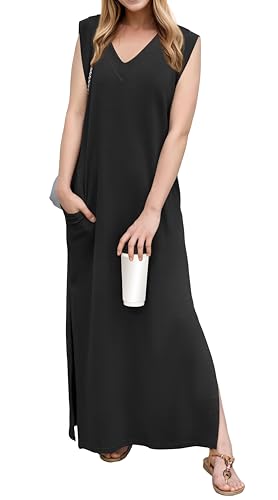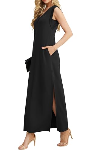 GRECERELLE Sommerkleid Damen Lang Leicht Elegant Knielang Casual Kleid V-Ausschnitt Freizeitkleid mit Taschen und Schlitz