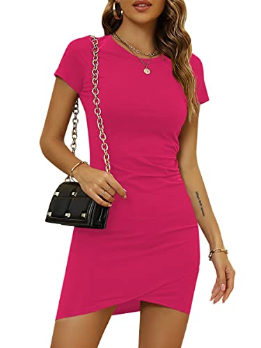 Laughido Damen Mini Kurzarm Wickelkleid Bodycon Sommerkleid Kurzes Rundhals Strandkleid Gerüscht Eng Tshirt Kleid