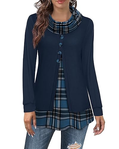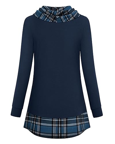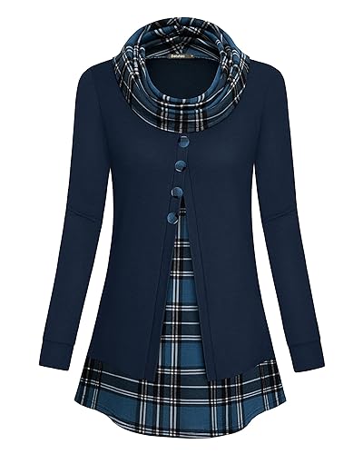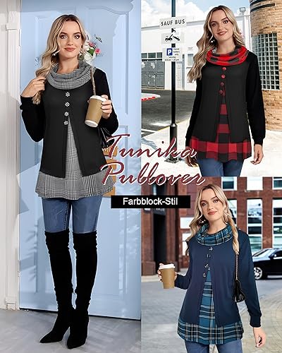 Tunika Damen Langarm Elegant 2 in 1 Pullover Lang Sweatshirt Schalkragen Patchwork Pulli