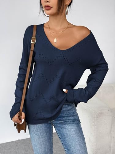 Zeagoo Damen Strickpullover Elegant Pullover V-Ausschnitt Häkelpullover Langarm Fashion Striken Pulli Einfarbig Lässige Oberteile S-XXL