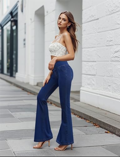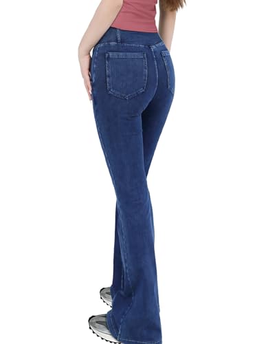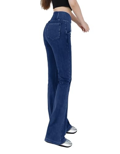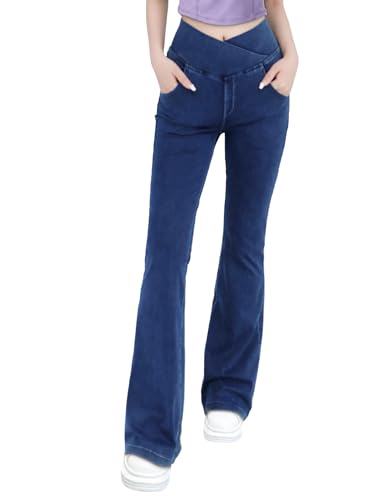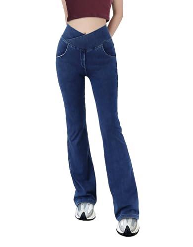 Damen V Crossover Hohe Taille Bauchkontrolle Casual Fitness Skinny Yoga Hosen, Faux Denim Print Frauen Bootcut Yoga Hosen, ausgestellte Fitness Hosen mit Seitentaschen