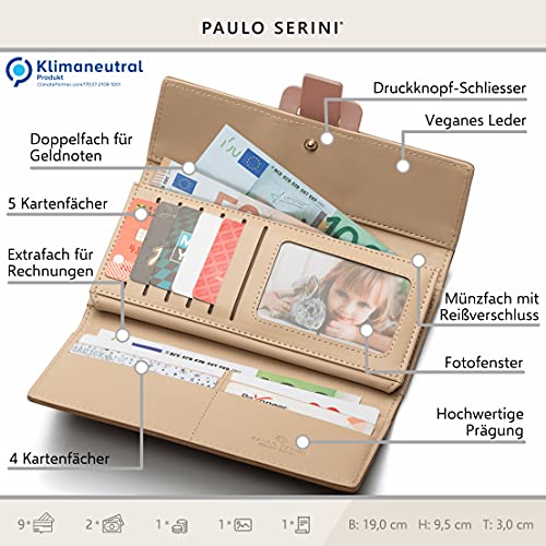 PAULO SERINI® Geldbeutel Damen Groß | Portemonnaie Geldbörse Frauen mit 9 Kartenfächer & Fotofenster | Elegantes Portmonee aus weichem 100% veganem Leder mit Münzfach