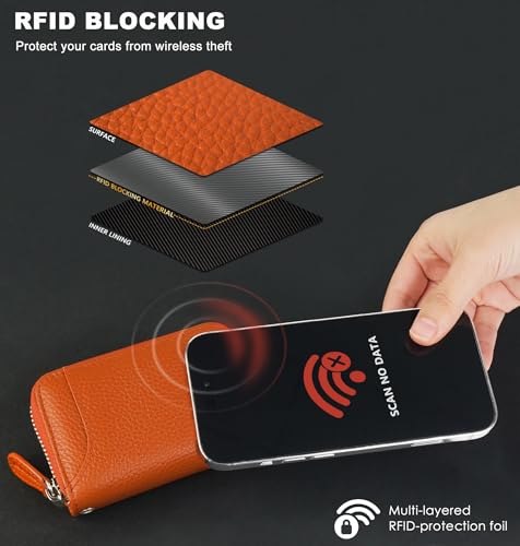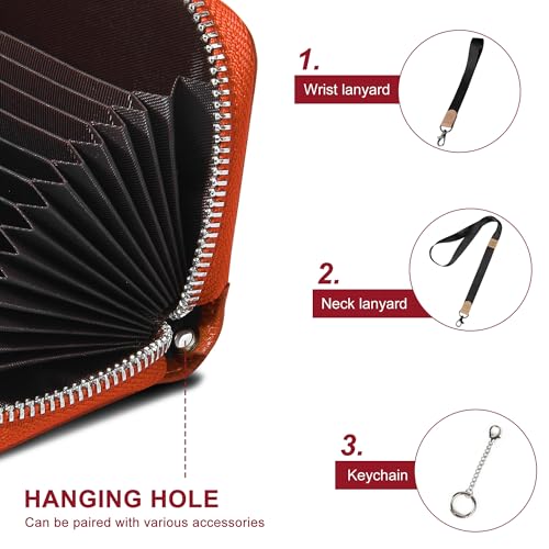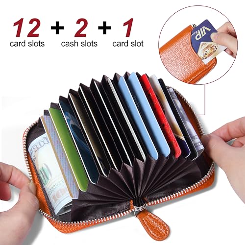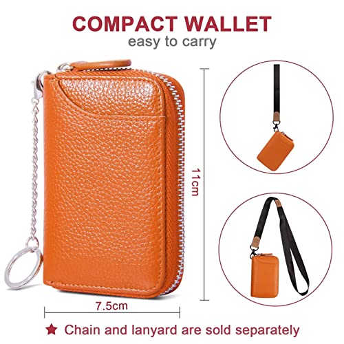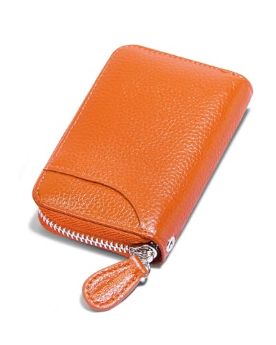 RFID Blocking Leather Wallet for Women Women’s Genuine Leather Credit Card Holder Ladies Small Blocked Accordion Wallets with Stainless Steel Zipper Woman Compact Accordian ID Cards Bag Orange