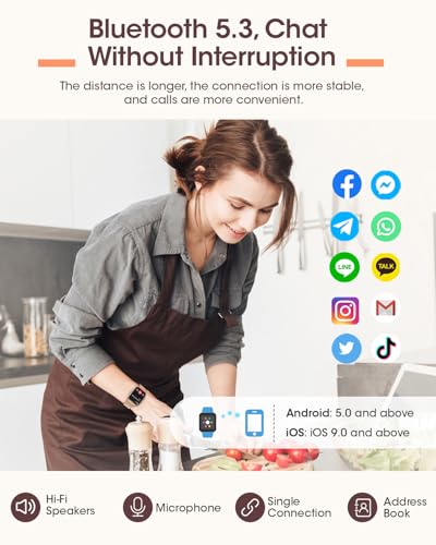 BLEIBEN SIE MIT DER WELT IN VERBINDUNG: Die Smartwatch Damen mit Telefonfunktion verfügt über den neuesten Bluetooth 5.3-Chip und hochauflösende Lautsprecher. Sie unterstützt nicht nur verschiedene Social-Media-Benachrichtigungen, um Sie über die neuesten Nachrichten auf dem Laufenden zu halten, sondern ist auch mit Android 5.0 und höher sowie iOS 9.0 und höher kompatibel. Dadurch deckt sie eine breitere Benutzerbasis ab und ermöglicht es uns, jederzeit mit der Welt in Verbindung zu bleiben!