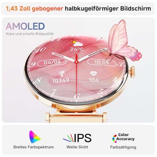 ⌚【1,43 Zoll AMOLED HD Touch Curved Bildschirm】— Smartwatch für Damen ist mit einem 1,43 zoll AMOLED-touch curved bildschirm ausgestattet, der Uhrendurchmesser beträgt 4,3CM, was Ihnen ein superweites Sichtfeld und eine einfache Bedienung ermöglicht. Mehr als 150 verfügbare Zifferblätter, einschließlich der Möglichkeit, Ihr Lieblingsbild als Zifferblatt einzustellen, um Ihren Look zu personalisieren