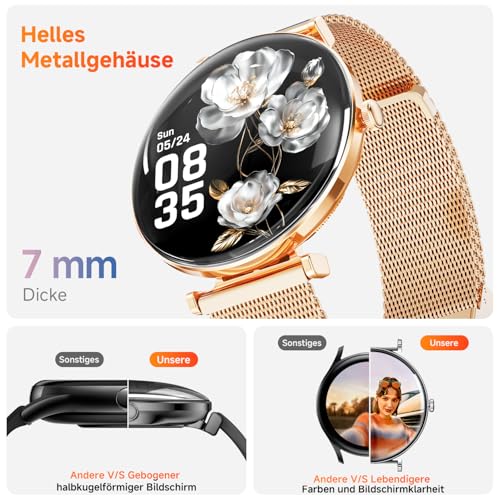 Smartwatch Damen, Konvexe Licht Dünn Smartwatch für Damen, 4,3 cm 1,43 Zoll AMOLED Touchscreen, Sportuhr mit Fitnessuhr, DIY Zifferblatt, Schlafüberwachung, Schrittzähler für Android iOS(Rose Gold)