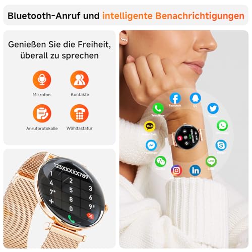 📲【Bluetooth-Anruf- und Benachrichtigungsuhr】 —Sportuhr hat ein eingebautes Mikrofon und einen Lautsprecher. Nach der Verbindung mit dem Bluetooth Ihres Mobiltelefons können Sie über die Uhr Anrufe empfangen und tätigen. So verpassen Sie keine wichtigen Benachrichtigungen – von E-Mails bis hin zu Social Media Updates (Facebook、WhatsApp、Skype、Instagram、Messenge). Darüber hinaus unterstützt die Smartwatch die Einstellung von Alarmen, Musik, Stoppuhr, Countdown-Timer und Handy-Finder. Diese Damenuhr macht Ihr Leben komfortabler