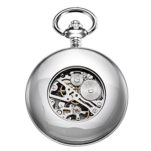 Unisex Taschenuhr mit Kette Analog Handaufzug Retro Skelett Hochglanz Poliert Silber