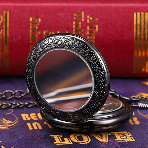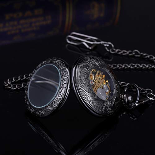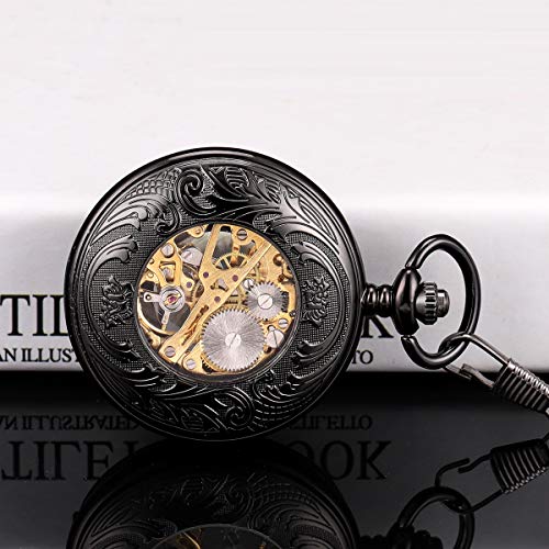 ManChDa Taschenuhr – Skelett-Taschenuhr, mechanisch, Lupe, spezieller Deckel, römische Zahlen, Fob Armbanduhr für Herren, mit Kette + Geschenkbox