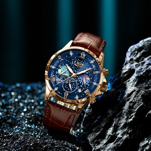 LIGE Männer Uhr Edelstahl Wasserdicht Analog Mondphase Design Quarz Armbanduhren Für Herren Chronograph Lederarmband Watch for Men Mit Datum Leuchtende Business Casual Retro Herren Uhren