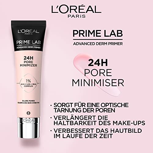 Lieferumfang: 1 x L’Oréal Paris Prime Lab 24HR Pore Minimiser Primer, Mattes Finish, Tarnt Poren, 24h Halt, Inhalt: 30ml