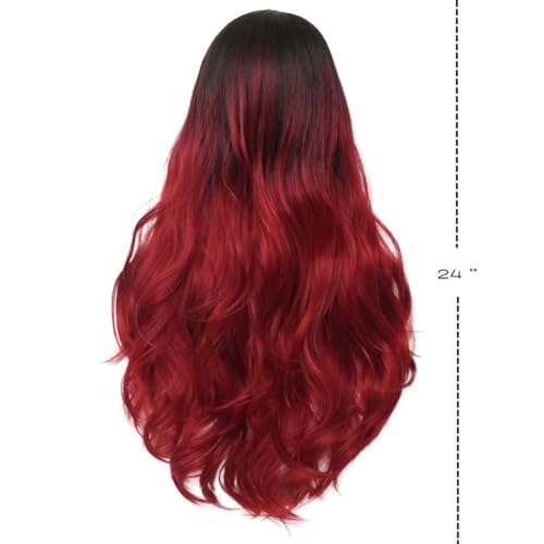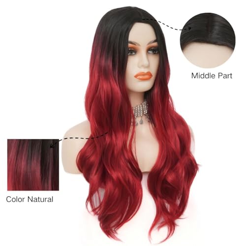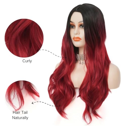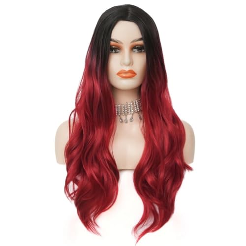 Damen Rot Lange Lockige Wellige Perücken Natürliche Ombre Schwarz bis Rot Mittelteil Haarperücke für Halloween Cosplay Gebrauch