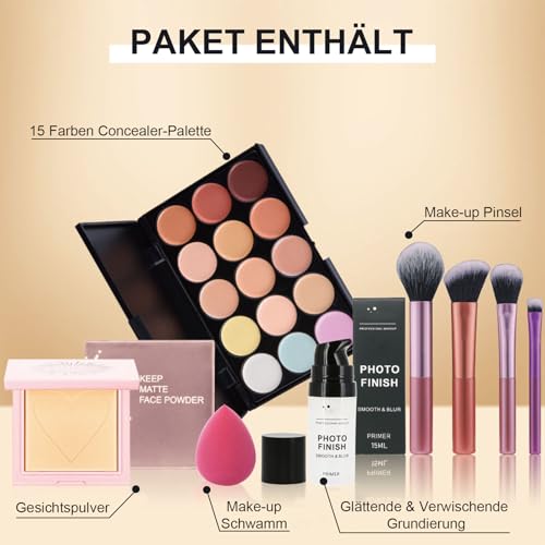 Make Up Set Für Gesicht, Schminkset Für Frauen Damen Mit Make Up Primer, Gesichtspuder, 15 Farben Concealer Palette, Makeup Pinsel Und Schwämme, Gesichts Schminke Geschenk Set