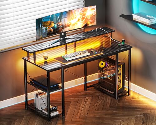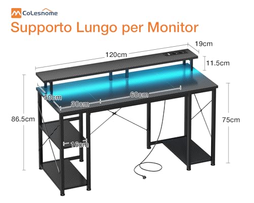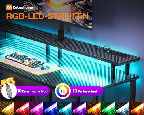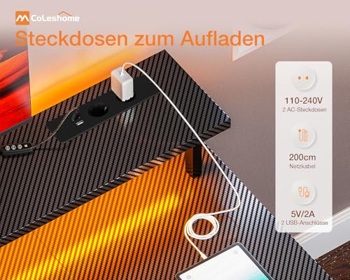 Coleshome Gaming Tisch mit LED-Beleuchtung, Gaming Schreibtisch mit 2 Steckdosen & 2 USB-Anschlüssen, Computertisch mit Monitorständer & Stauraum, Home Office Schreibtisch, Schwarz, 120x50cm
