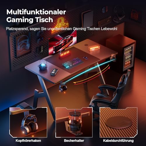 Gaming Tisch 120 x 60 cm, Gaming Schreibtisch, Stabiler PC Schreibtisch mit Kohlefaserbeschichtung, Ergonomischer Computertisch mit Kopfhörerhaken und Getränkehalter, Schwarz