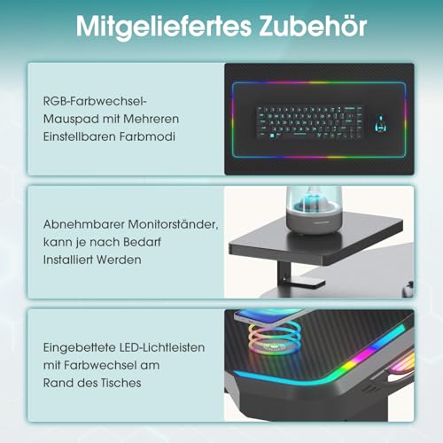 LED-GAMER-DESKTOP: Der Schreibtisch ist mit farbwechselnden LED-Leuchten auf beiden Seiten des Tisches in einer Vielzahl von Farben ausgestattet, die Sie selbst wählen können, und mit dem von devoko gelieferten RGB-beleuchteten Mauspad sorgt er für eine blendende Gaming-Atmosphäre
