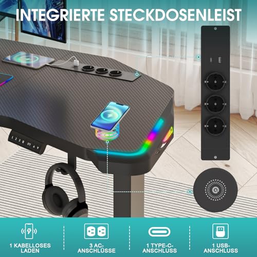 LED Gaming-Tisch 186cm, Höhenverstellbarer Schreibtisch, Höhenverstellbar Elektrisch mit Kabellosem Ladegerät, Steckdose, RGB-Mauspad und Tastaturablage, Computertisch