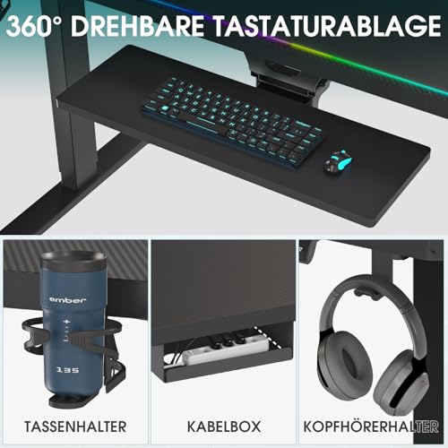 VIELFÄLTIGES ZUBEHÖR: Der Devoko höhenverstellbare Gaming-Schreibtisch wird mit einer um 360° drehbaren Tastaturablage geliefert, damit Sie die für Sie bequemste Position finden. Die Kabelaufbewahrung, der Becherhalter und der Kopfhörerhaken sorgen für Ordnung auf dem Schreibtisch
