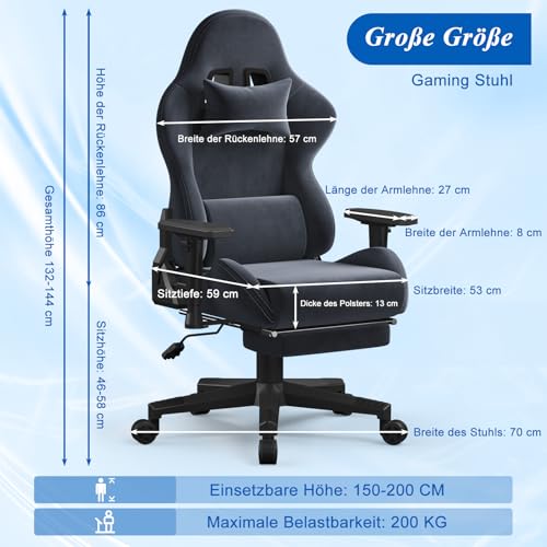Gaming Stuhl Ergonomisch, Hochwertiger Stoff Bürostuhl weich und atmungsaktiv, 90-170°Rückenlehne verstellbar Gamer Stuhl, Gamingsessel Massage, Gamingstuhl mit Verstellbare Armlehnen, Gray