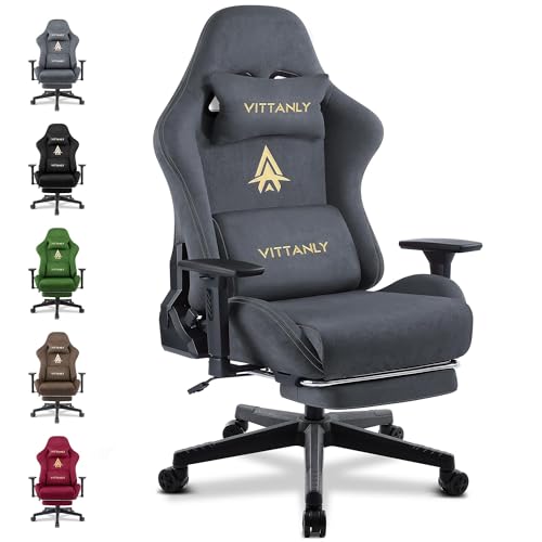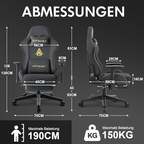 【Ausgezeichnetes Material】Der VITTANLY Gaming-Stuhl ist aus hochwertigem Wildlederimitat gefertigt, dem Innenraumgewebe von Luxusautos sehr nahe kommt. Das Material ist strapazierfähig und verschleißfest, weich und bequem. Im Vergleich zu Leder ist es atmungsaktiver, was Sie im Winter warm hält und im Sommer das Schwitzen minimiert. Zusammen mit dem 10 cm dicken Sitzkissen aus hochdichtem Schaumstoff sorgt dies für ein komfortables Erlebnis, perfekt für stundenlanges Spielen und Arbeiten.