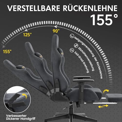 【Komfortabler Computerstuhl】Der Rücken des Gaming Stuhls ist von 90° bis 155° verstellbar und mit einer praktischen, ausziehbaren Fußstütze ausgestattet. Ob für Arbeit, Spiel oder Entspannung, Sie finden immer den idealen Winkel zur Reduzierung von Körperermüdung und Steigerung der Stimmung.