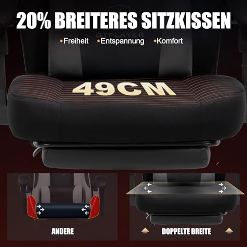 【Breiter Sitz für maximale Unterstützung】 Der bequeme Bürostuhl ist mit einem extra breiten Sitzkissen ausgestattet, das ausreichend Platz und Komfort für alle Körpertypen bietet. Egal, ob Sie arbeiten oder spielen – der großzügige Sitz sorgt für Entspannung und hohen Sitzkomfort, selbst über längere Zeiträume hinweg.