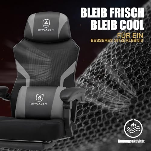 GTPLAYER Gaming Stuhl mit Fußstütze, ergonomischer Bürostuhl mit Netzrückenlehne, Schreibtischstuhl Gaming Sessel aus Stoff für Zuhause und Büro (grau)