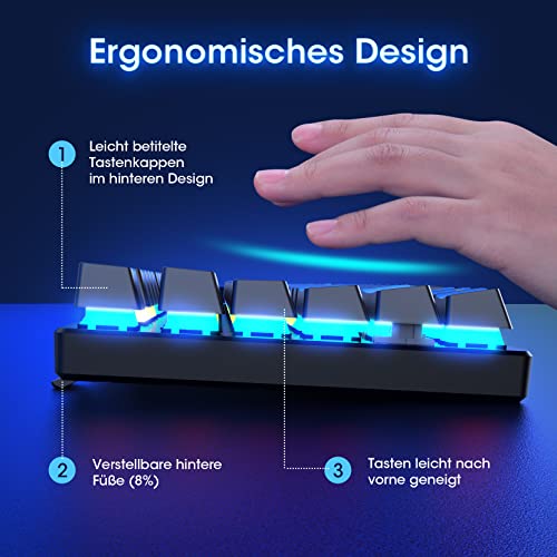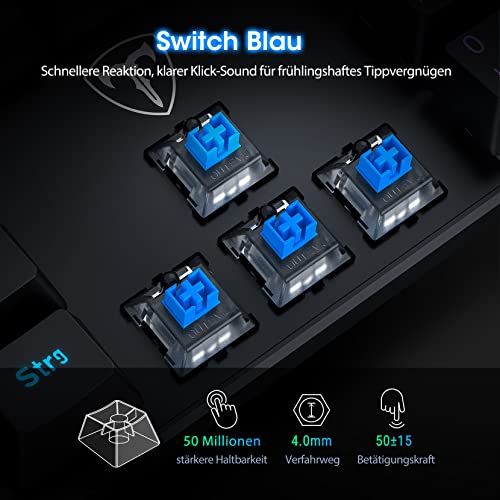【Mechanische Tastatur】: Reaktionsschnelle blaue Schalter: Die RisoPhy-Tastatur verfügt über Klick-Tasten, die Ihnen eine höhere Genauigkeit und schnellere Reaktion mit einem angenehmen Klick-Sound beim Tippen bieten. Diese Tastatur ist bequemer zu tippen, da sie eine tiefere Tastenreise, mehr Feedback und mehr Platz zwischen den Tasten bietet. Für diejenigen, die Tastaturen mit einem taktileren und „Klick“-Gefühl bevorzugen, ist unsere Tastatur mit blauen Schalter eine gute Wahl.