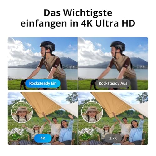 4K Ultra-Stabilisiertes Video [8] – Egal, ob du wanderst, Kajak fährst oder einfach nur in einem windigen Park spazieren gehst, die Stabilisierungstechnologie von DJI, die Windresistenz (Stufe 4) und 4K UHD sorgen für reibungslose, hochwertige Aufnahmen.