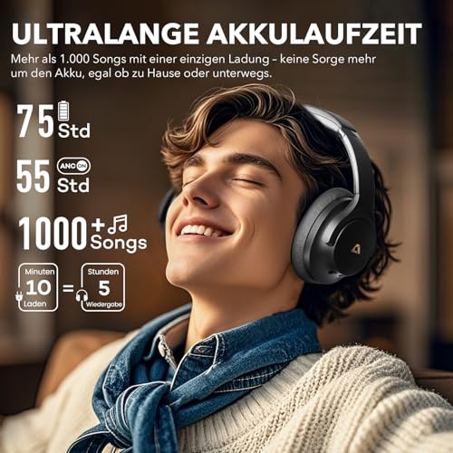 [AUSHALTZEIT BIS ZU 75 STUNDEN] Bis zu 75 Stunden Spielzeit im Standardmodus oder 55 Stunden mit aktiver Rauschunterdrückung. Eine einzelne Aufladung reicht für lange Reisen, den ganzen Tag oder für mehr als 1.000 Lieder.