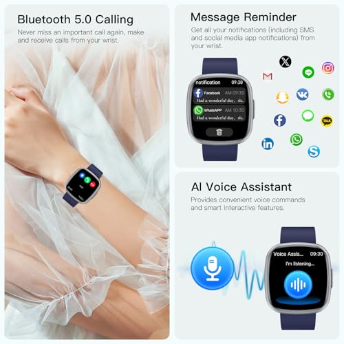Verschiedene nützliche Funktionen: Die Smartwatch ist mit einem großen Akku ausgestattet, der im Alltag 3-5 Tage Nutzung ermöglicht und eine Standby-Zeit von über 20 Tagen bietet. Sie können außerdem den AI-Sprachassistenten nutzen, um Fragen zu stellen, Musik abzuspielen, Wecker und Timer zu setzen, das Wetter zu prüfen und vieles mehr. Diese Fitnessuhr verfügt über praktische Funktionen wie Menstruationsverfolgung, Atemtraining, Taschenrechner, Spiele, Wecker und Sitzzeit-Erinnerungen.