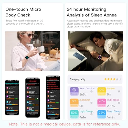 BMI/Mikro-Checkup-Funktion: Die Smartwatch kann die Körperzusammensetzung messen, innerhalb von 30 Sekunden schnell Körperdaten erfassen und einen Analysebericht erstellen. Die Mikro-Checkup-Funktion ermöglicht es, mit nur einem Tastendruck innerhalb von 30 Sekunden fünf Gesundheitsindikatoren – Herzfrequenz, Blutsauerstoff, Blutdruck, Stress und Körpertemperatur – zu messen. Darüber hinaus kann die Smartwatch emotionale Schwankungen und den Ermüdungsgrad erkennen.