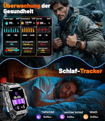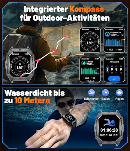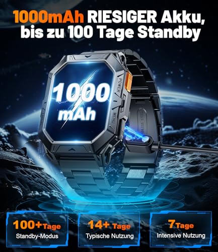 【1000mAh Batterie für 50 Tage Akkulaufzeit】 Militär Smartwatch herren verfügt über eine 1000mAh Batterie, die bis zu 50 Tage Standby-Zeit und 20 Tage normale Nutzung bietet, wodurch die Notwendigkeit für häufiges Aufladen reduziert wird. Mit nur 3 Stunden Ladezeit sorgt diese Batterie für zuverlässige Energie, auch an hektischen Tagen, und ist somit eine ideale Wahl für diejenigen, die eine zuverlässige Smartwatch suchen, die mit ihrem aktiven Lebensstil Schritt halten kann, sowie eine großartige Geschenkoption.